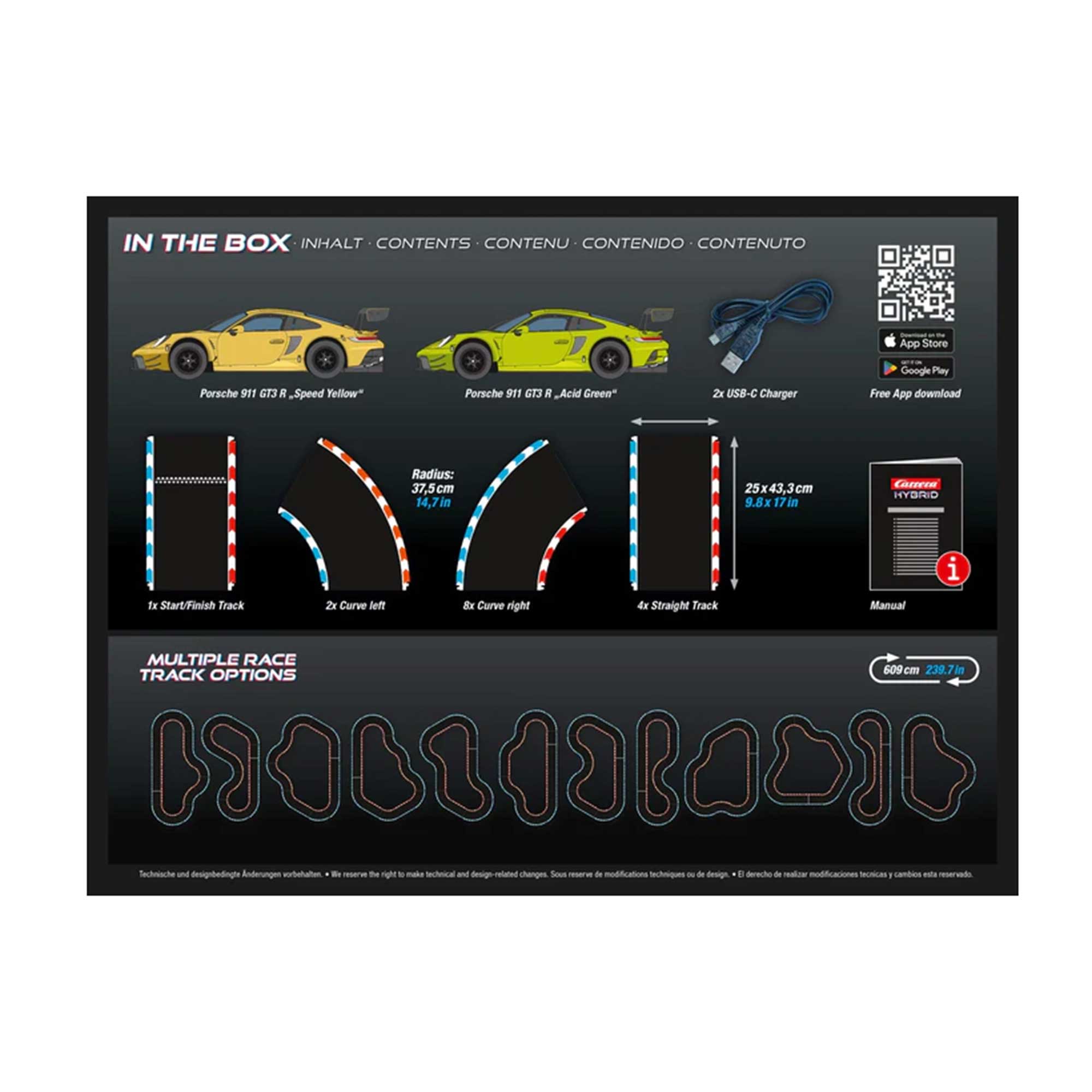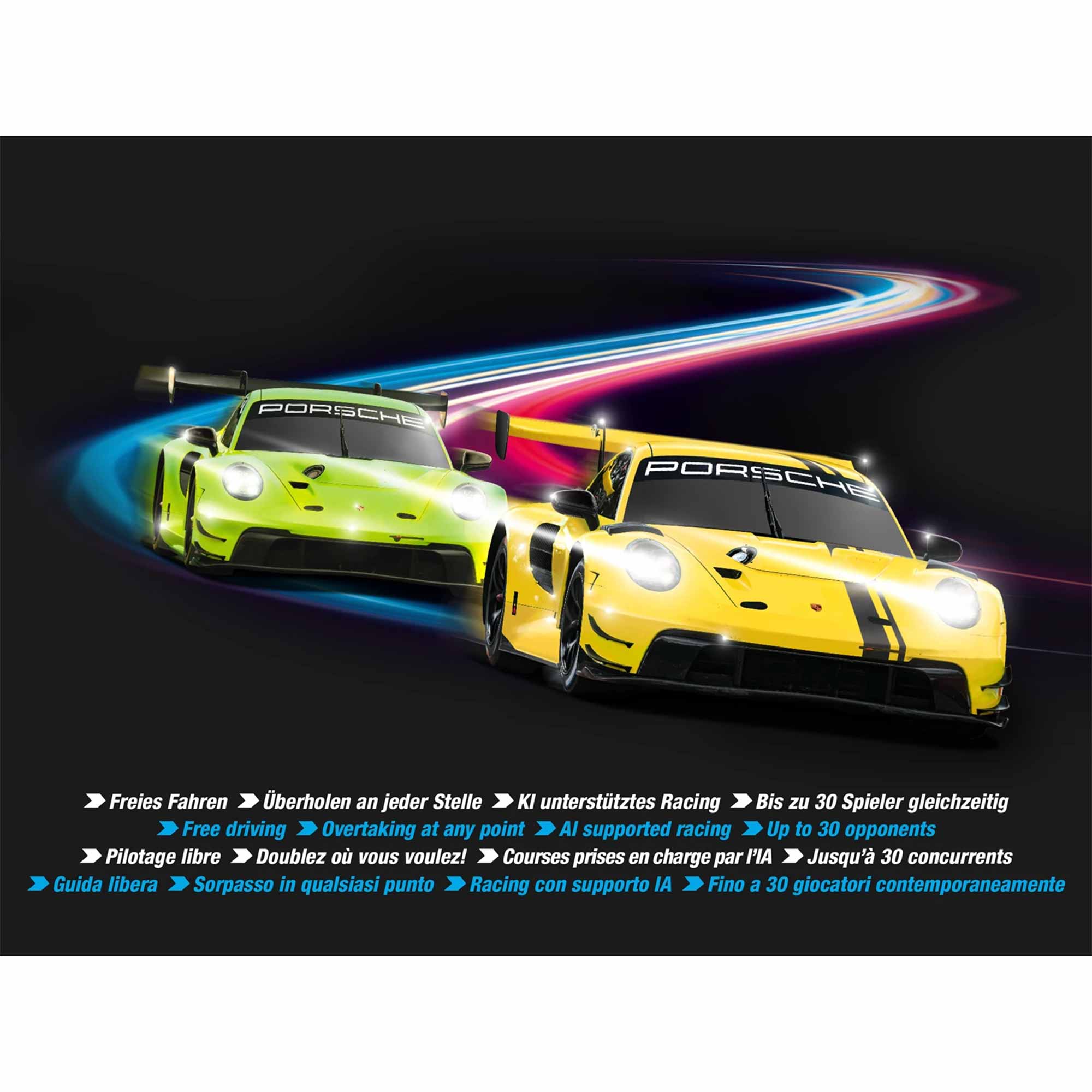 – Zwei detailgetreue Porsche 911 GT3 R-Modelle (Acid Green & Speed Yellow)